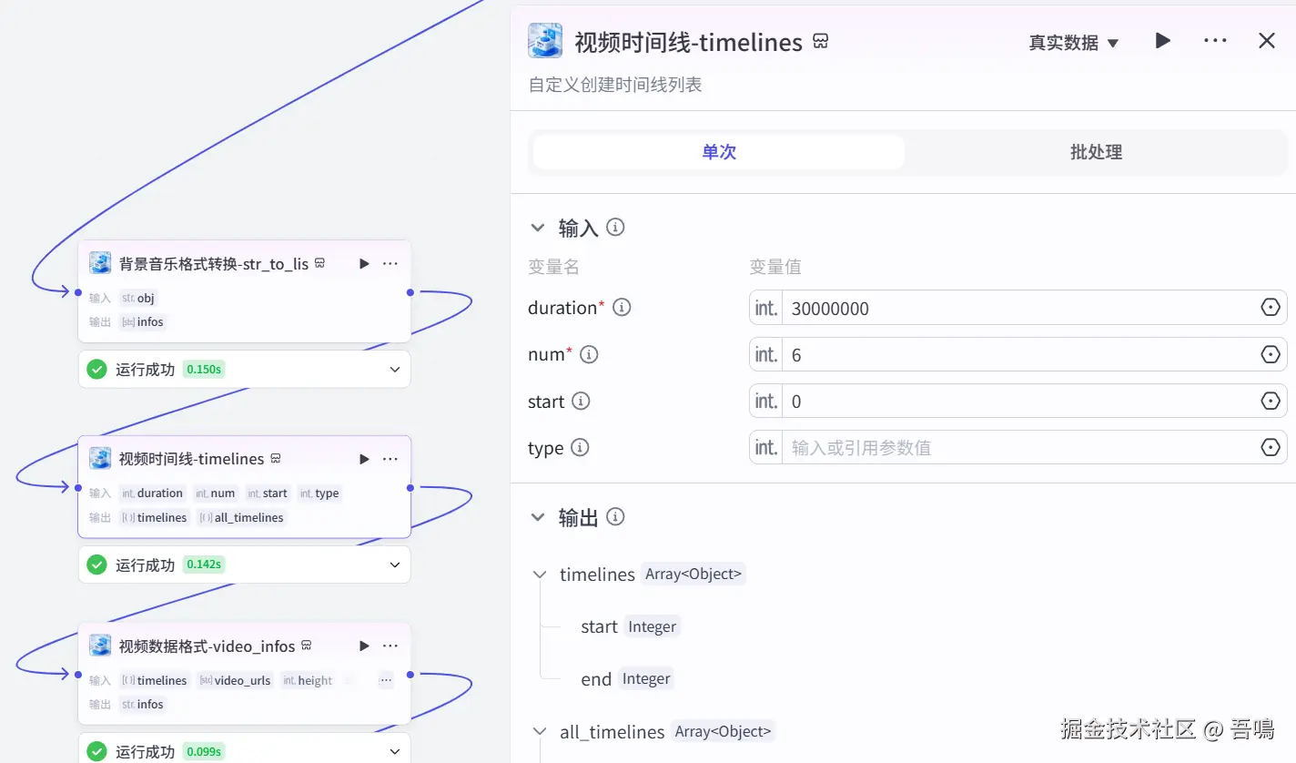 这个节点使用到了扣子第三方插件【剪映小助手数据生成器】的【timelines】工具,生成视频的时间线。