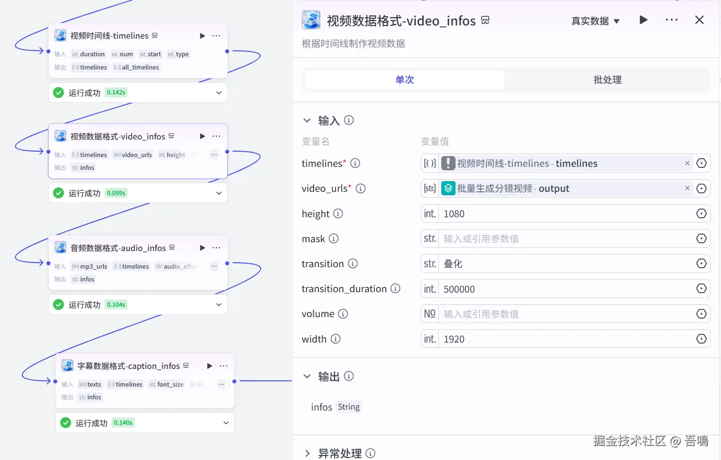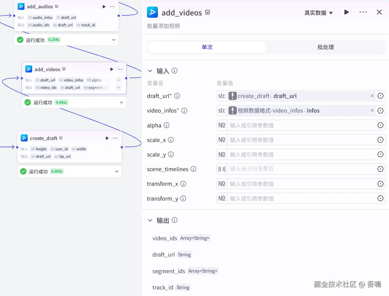 这个节点使用到了扣子第三方插件【剪映小助手数据生成器】的【video_infos】工具,视频数据转成剪印小助手所需要的格式。