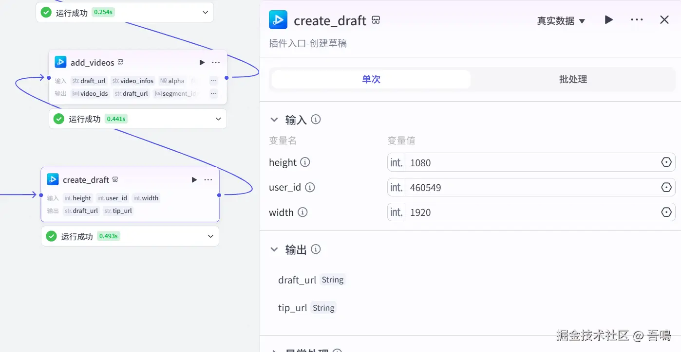 这个节点使用到了扣子第三方插件【视频合成_剪印小助手】的【create_draft】工具,创建剪印草噶。