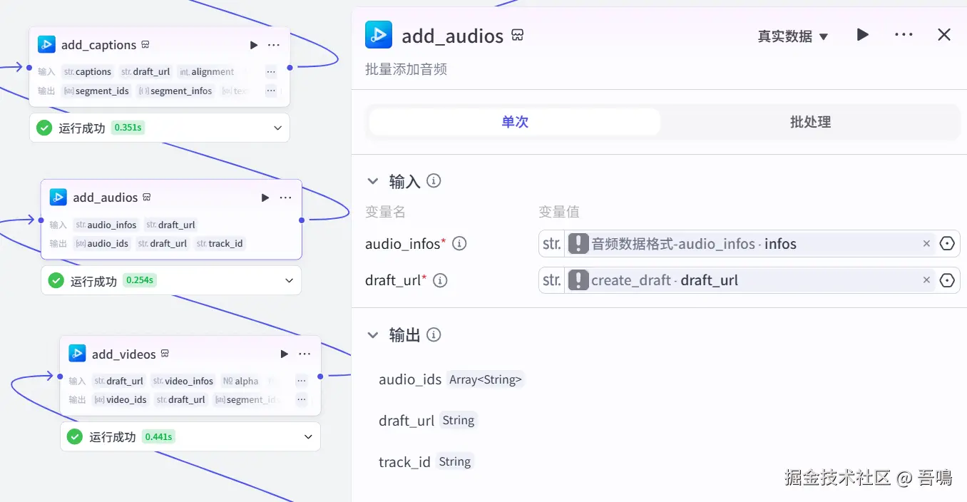 这个节点使用到了扣子第三方插件【视频合成_剪印小助手】的【add_audios】工具,往剪印草稿中添加背景音乐。