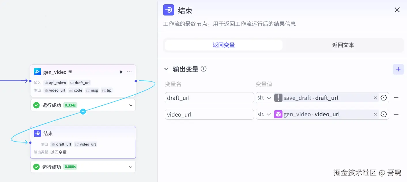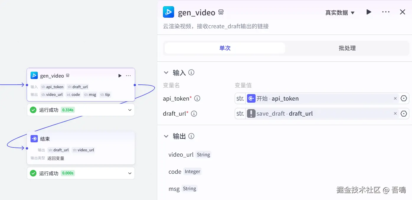 这个节点使用到了扣子第三方插件【视频合成_剪印小助手】的【gen_video】工具,剪印草稿视频云渲染。