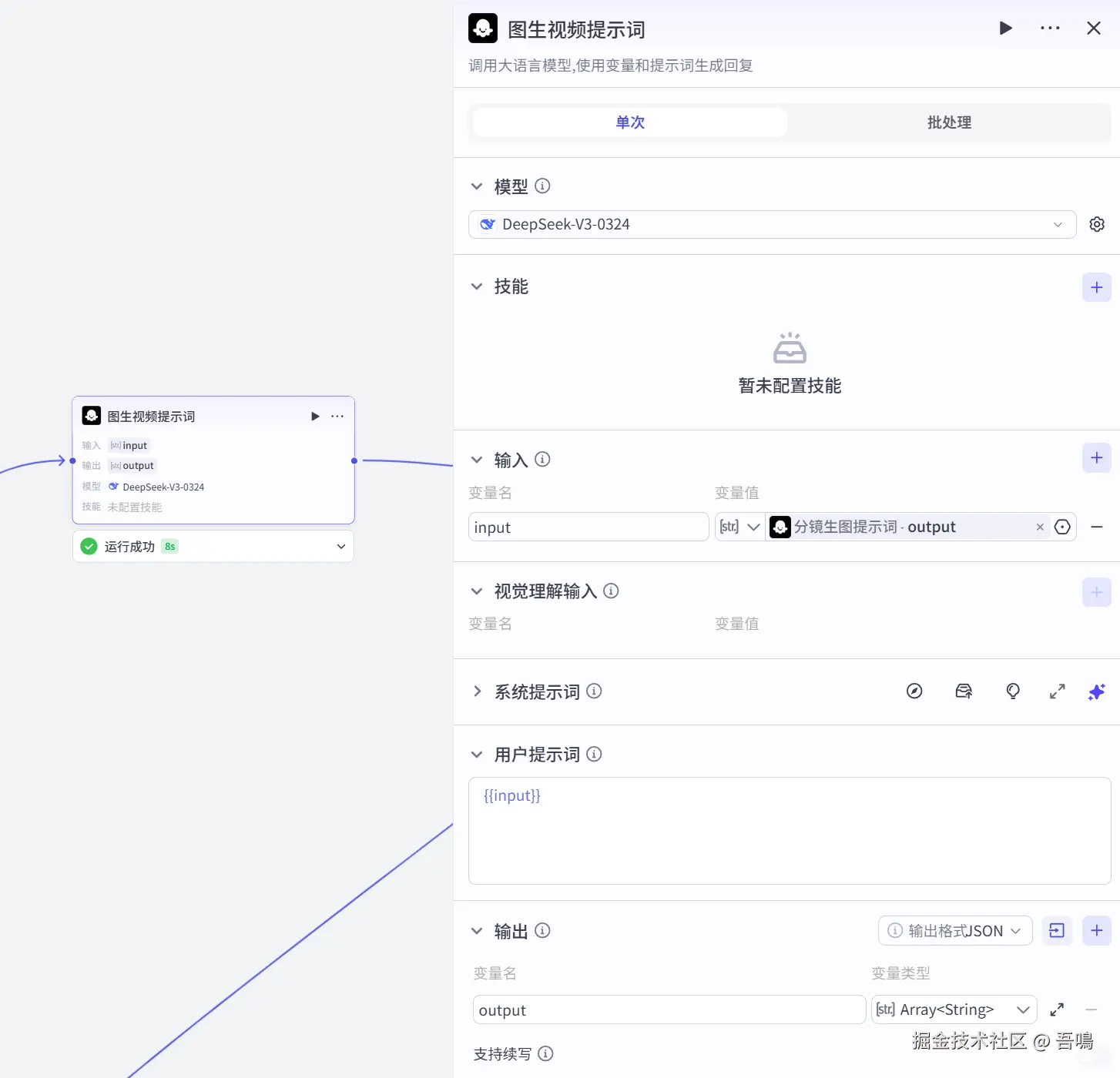 这个节点使用到了扣子官方的【大模型】节点,用于生成视频提示词,它的参数如下: