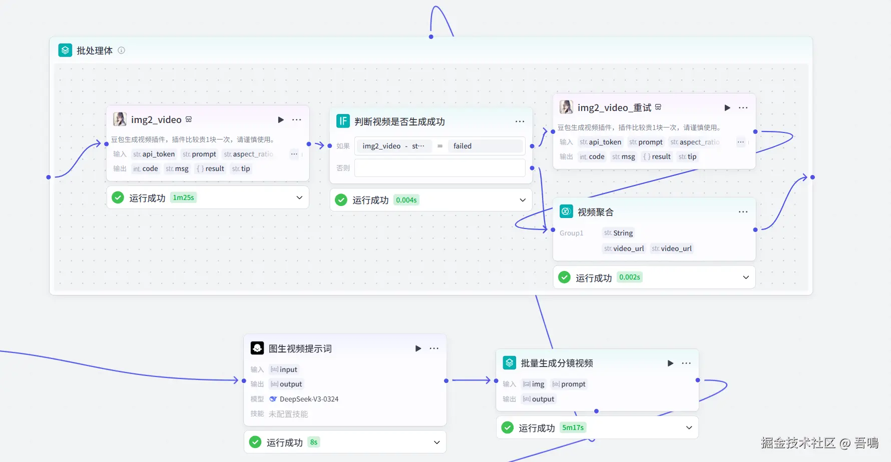 这个节点使用到了扣子的第三方插件【豆包图生视频】的【img2_video】工具。需要注意的是,这个插件按照调用次数收费,一次一块钱,比较贵。