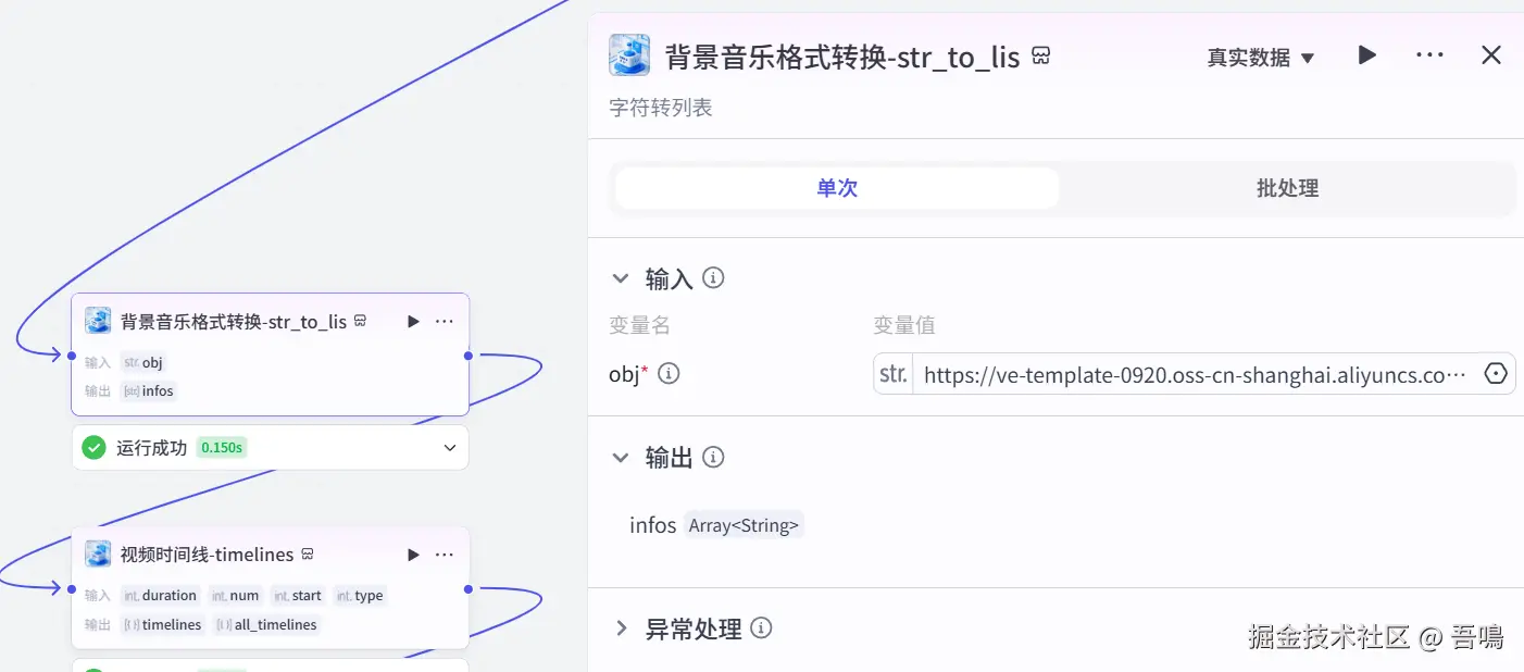 这个节点使用到了扣子第三方插件【剪映小助手数据生成器】的【str_to_list】工具,背景音乐转成剪印插件需要的数据格式。
