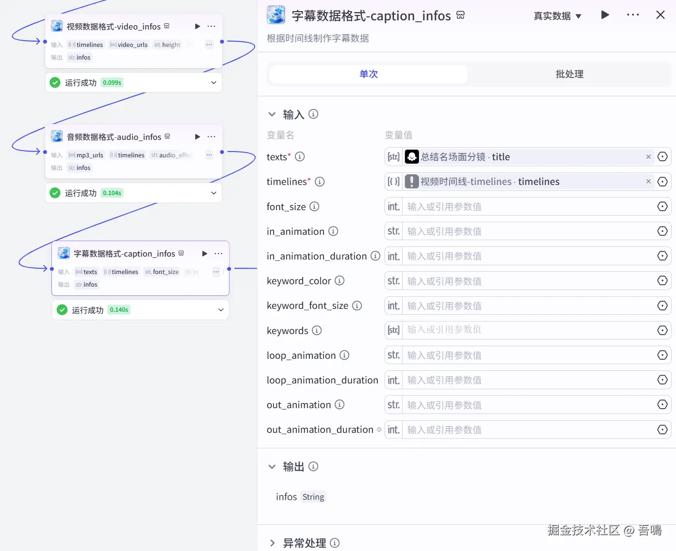 这个节点使用到了扣子第三方插件【剪映小助手数据生成器】的【caption_infos】工具,字幕转成剪印小助手需要的格式。