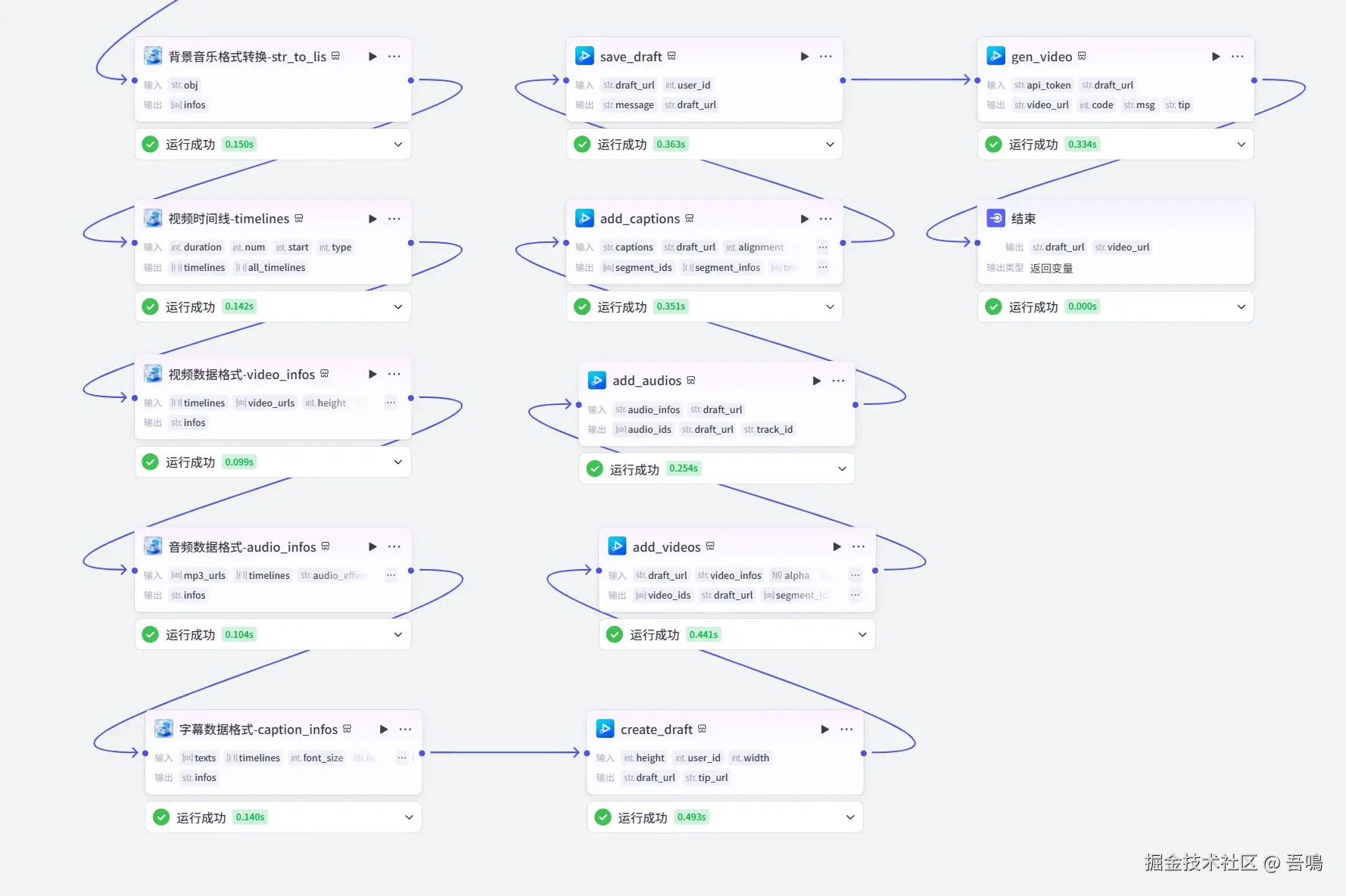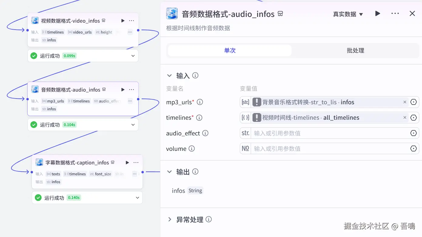 这个节点使用到了扣子第三方插件【剪映小助手数据生成器】的【audio_infos】工具,背景音乐转成剪印小助手需要的格式。
