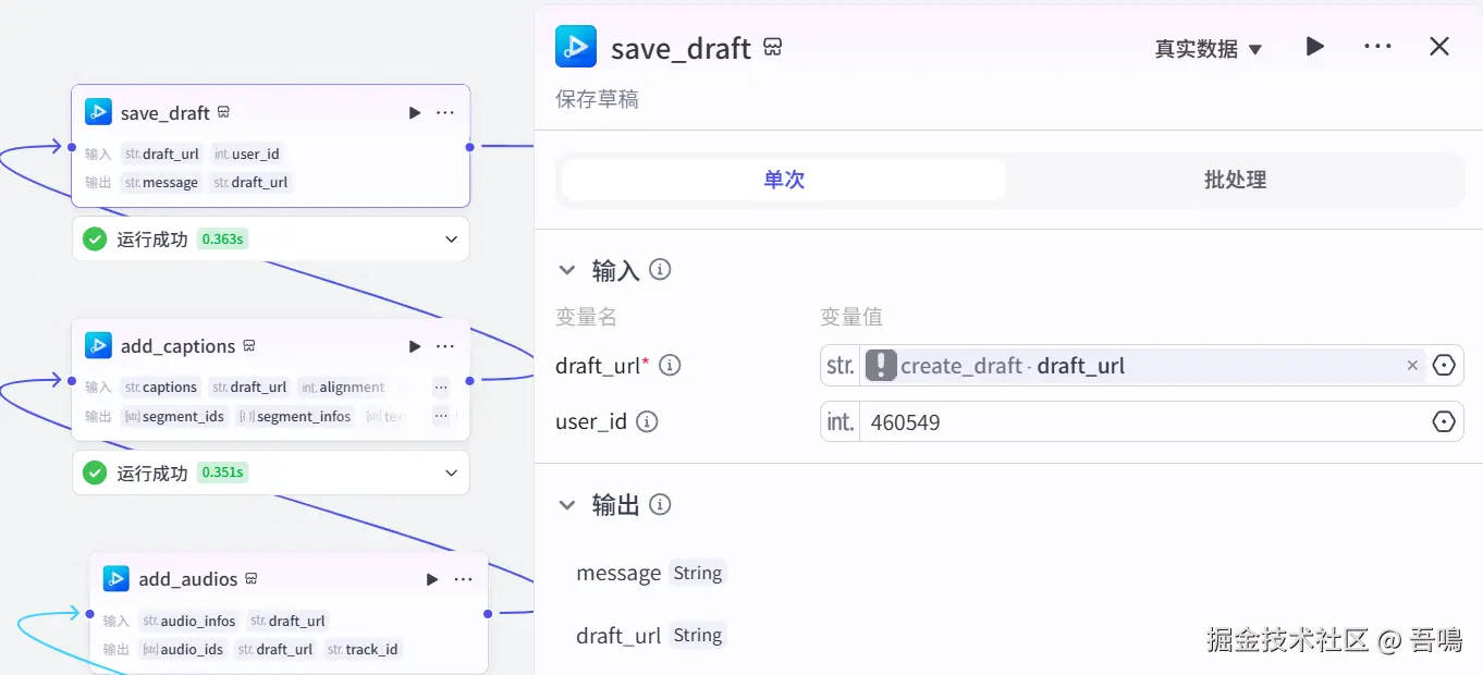 这个节点使用到了扣子第三方插件【视频合成_剪印小助手】的【save_draft】工具,保存剪印草稿。