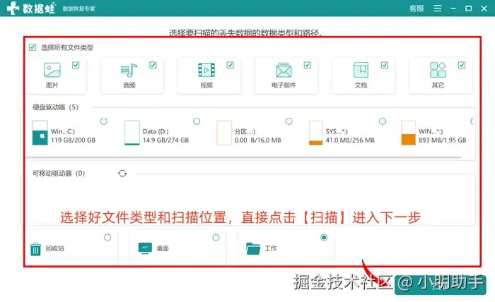 数据 蛙恢复专家能够帮助我们轻松做到以下目标:回收站数据恢复、硬盘数据恢复、分区问题数据恢复、储存卡数据恢复、闪存驱动器数据恢复、系统崩溃数据恢复。并且,该软件支持多种文件类型的扫描恢复,最为常见的文档、电子邮件、视频、图片、音频还可以作为扫描条件进行设置,让我们的文件扫描更为高效。