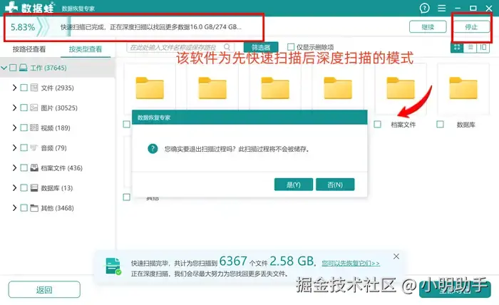 第2步: 待到软件的左上角显示【扫描完成】后,可以选择先进行恢复,还是继续进行深度扫描(该操作不会损坏文件);