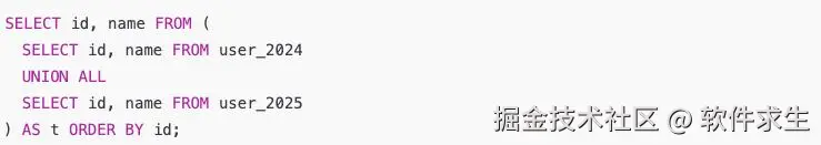 - 查询两类不同类型的订单(线上订单表 + 线下订单表),业务逻辑上不可能重复。