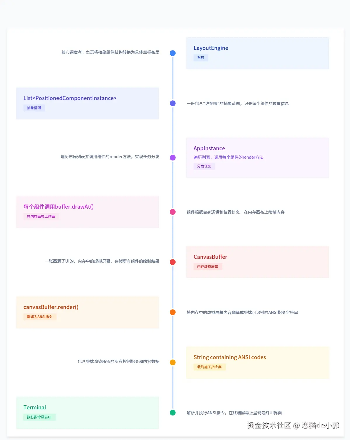 这个列表就是整个 UI 的控件级别的最终布局蓝图,前面我们讲到的渲染系统 (AppInstance 中的 render 方法) 会接收这个列表,遍历它,并告诉每个组件:“好了,你的位置和大小已经确定了(就是这个 Rect),现在请在这个区域内把自己画到 CanvasBuffer 上吧!”