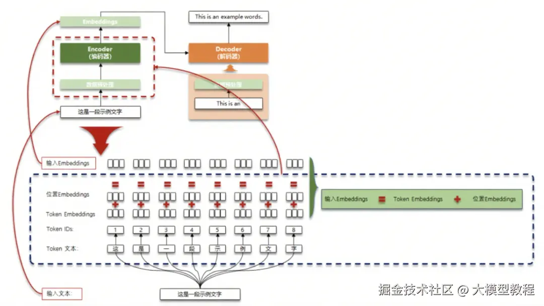 以图中 “这是一段示例文字” 的处理为例,首先进行数据预处理,将文本分词得到 “这”“是”“一”“段”“示”“例”“文”“字” 这些 token。接着构建词表,为每个 token 分配唯一的 Token IDs,如 “这” 对应 1,“是” 对应 2 等。然后生成 Token Embeddings,也就是每个 token 对应的语义向量。同时,为了让模型理解文本的顺序信息,还会生成位置 Embeddings,用于表示每个 token 在文本中的位置。最后,将 Token Embeddings 和位置 Embeddings 相加,得到输入 Embeddings,输入到后续的模型中进行处理。