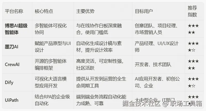 2.选择合适的平台或框架:根据你的技术背景和需求,选择一个合适的工具。对于非开发者,可以选择像博思AI超级智能体这样开箱即用的一站式AI平台;对于开发者,则可以选择像CrewAI或Dify这样的开源框架。