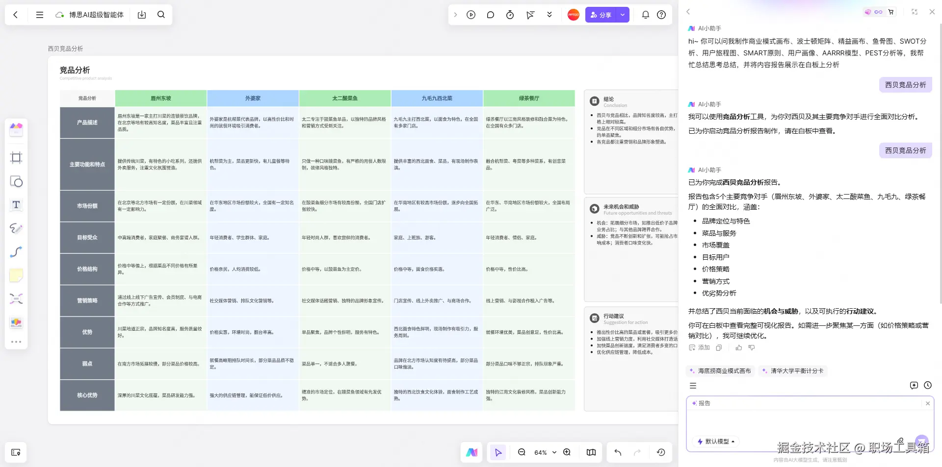 博思AI超级智能体将AI能力巧妙地集成在博思白板(boardmix)这一在线协作工具中,创造了一种全新的工作模式。boardmix将AI智能体的强大功能与无限延伸的在线画布深度融合,允许用户在一个共享的可视化空间里,通过简单的自然语言指令,调动来自不同领域的多个AI智能体协同完成任务。