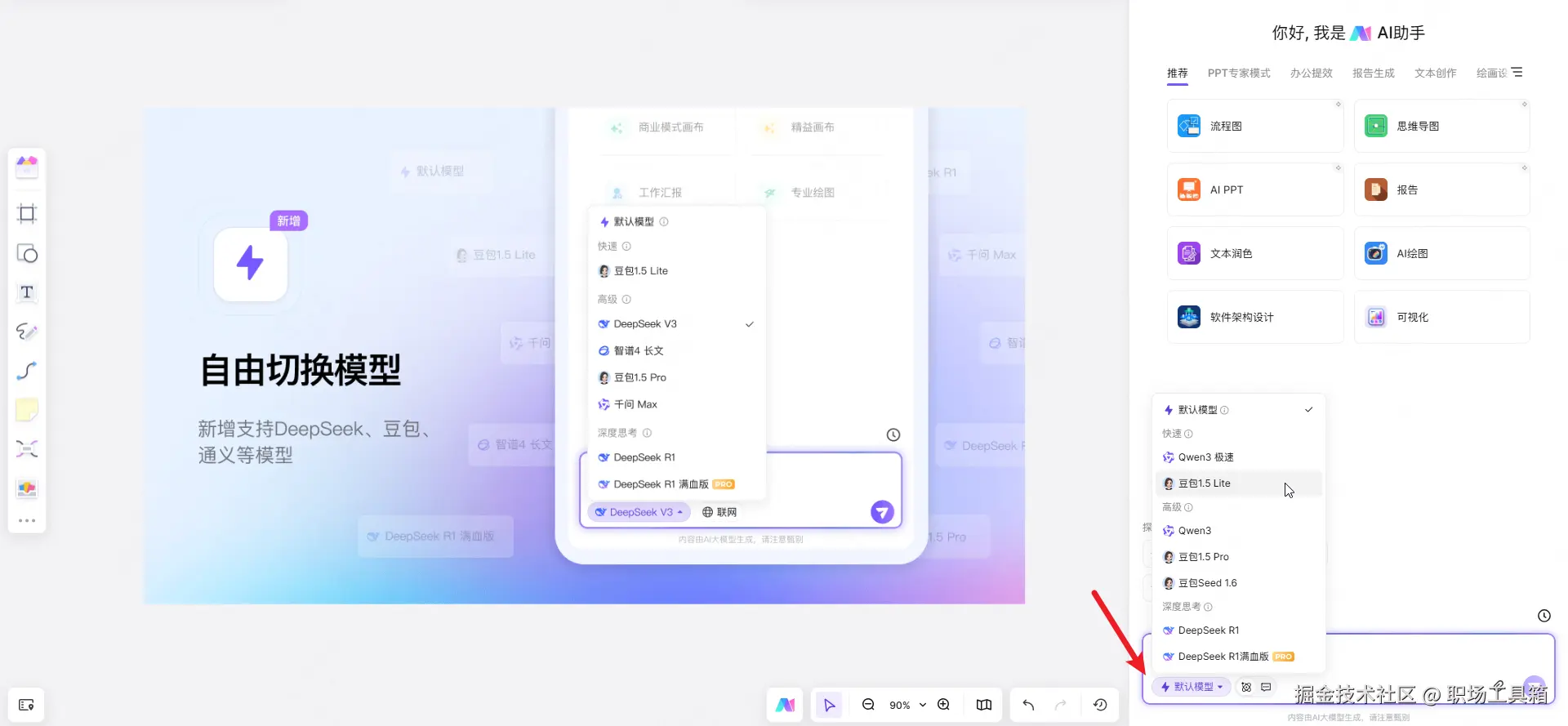 值得一提的是,博思AI还整合了多个国内主流的AI大语言模型,包括DeepSeek、豆包和通义大模型,在使用博思AI的过程中,可点击输入框左下角的“默认模型”,一键切换到其他的AI大模型,免去在不同AI模型之间来回横跳。