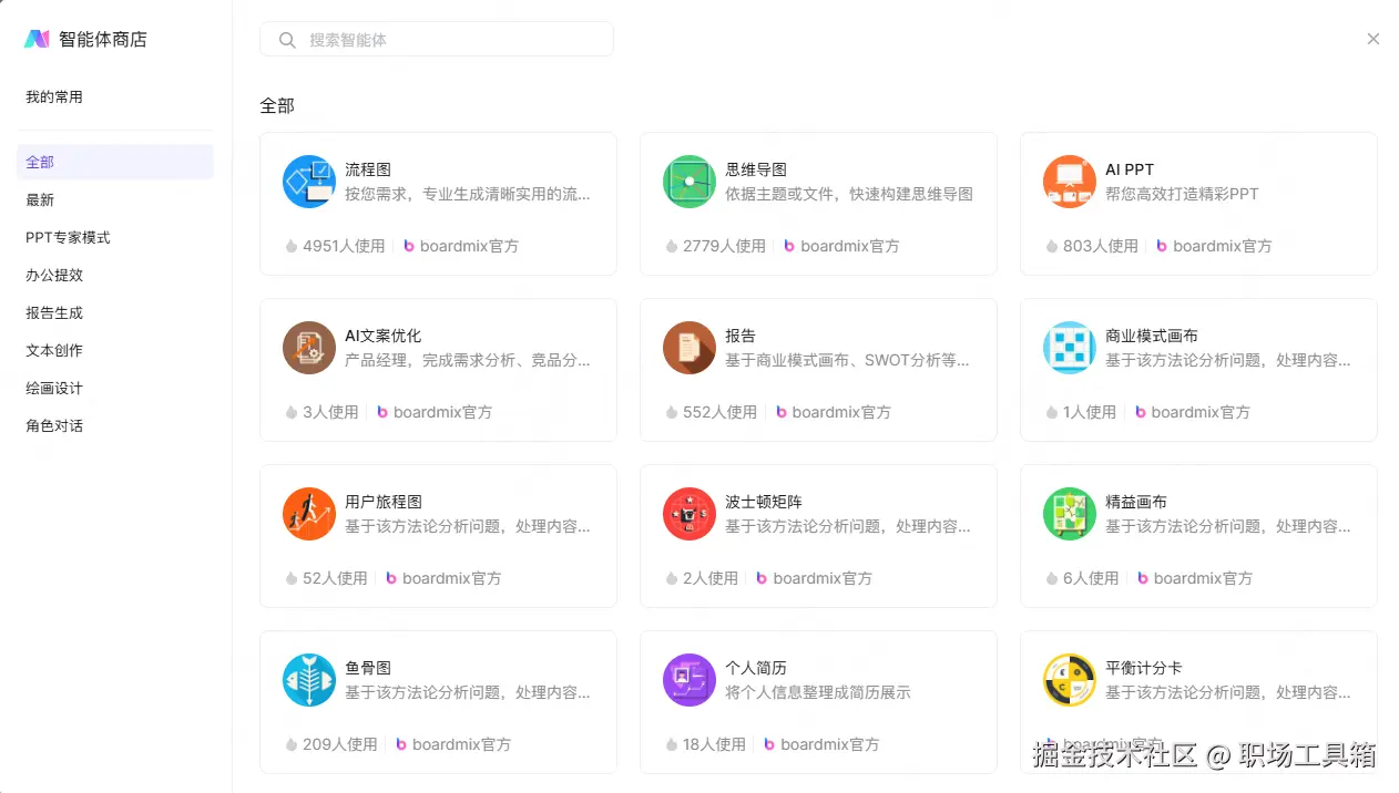 博思AI智能体突出的亮点在于“多智能体协同”机制,博思AI内置了下图的“智能体商店”,汇集了上百款覆盖不同专业领域的AI智能体,从思维导图专家、流程图助手、AI PPT生成器到市场分析师等,一应俱全。