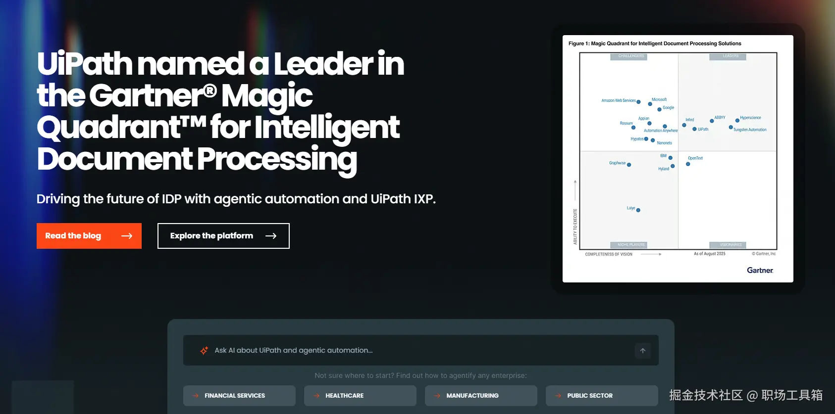 作为全球机器人流程自动化(RPA)领域的公认领导者,UiPath近年来积极拥抱人工智能,将其行业领先的RPA能力与前沿的AI智能体技术深度结合,推出了一个全面的企业级自动化平台。UiPath的独特之处在于,它将AI智能体的“认知大脑”与RPA机器人的“执行手脚”实现了完美协同。