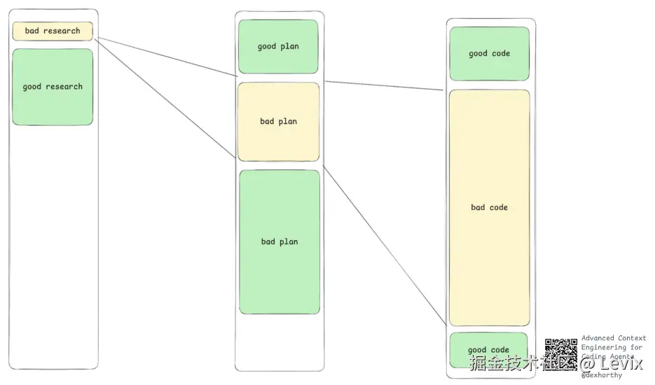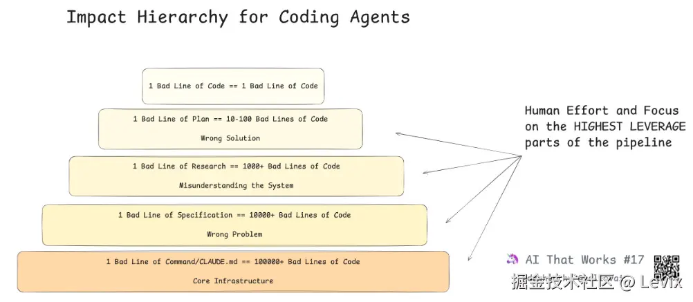 一行糟糕的代码终究只是一行糟糕的代码。但若规划中出现疏漏,便可能衍生出数百行问题代码。而调研阶段的失误——比如误解代码库运作机制或功能模块位置——更可能引发数千行代码的连锁问题。