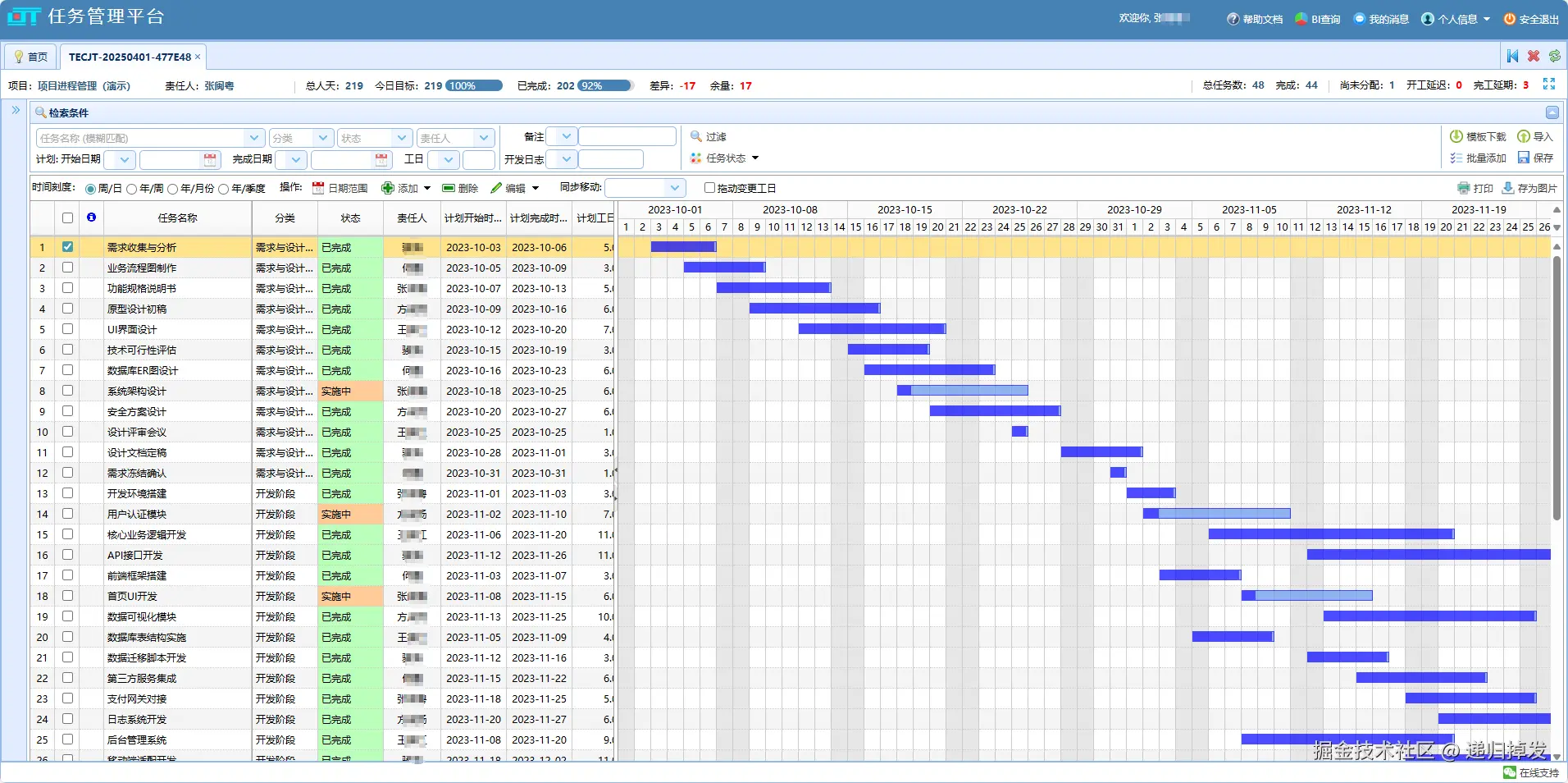 在PJMan的甘特图中,您可以轻松地将任务拖拽分配给具体成员,并明确责任与要求。每位成员都能在自己的工作台看到待办事项,完成任务后一键勾选,进度自动同步更新。这种透明的责任机制,确保了“事事有人管,人人有事干”。