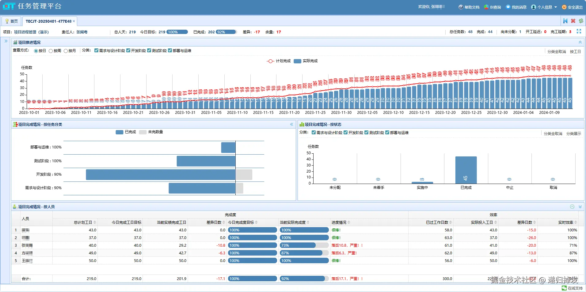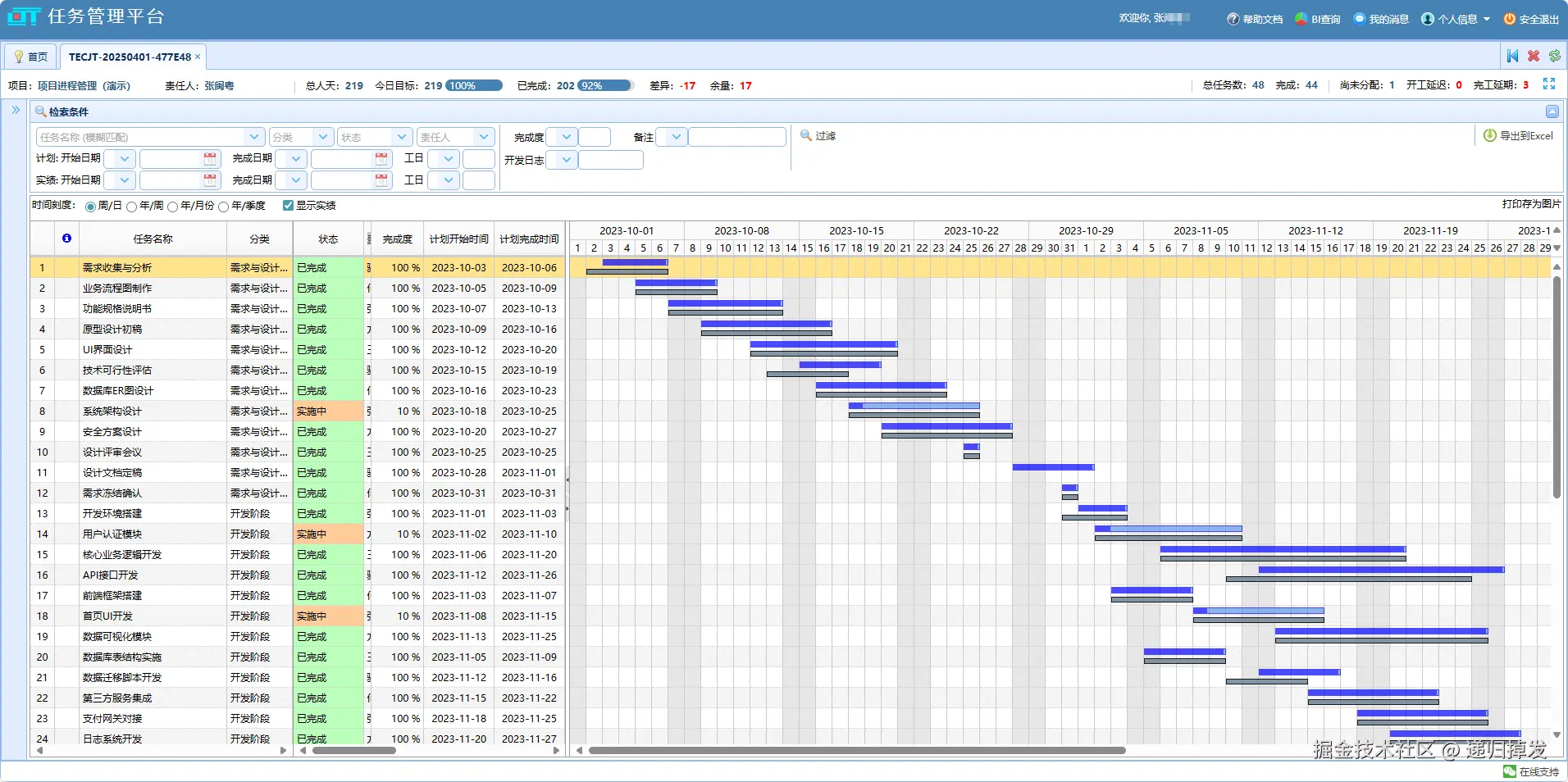 - 破局思路:PJMan提供了可视化的项目进度和健康度仪表盘。项目经理可以一目了然地看到整体进度、任务完成率、以及可能的风险点(如:延期任务被高亮显示)。通过设置里程碑和关键路径,系统能辅助项目经理提前识别风险,变被动为主动。