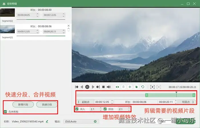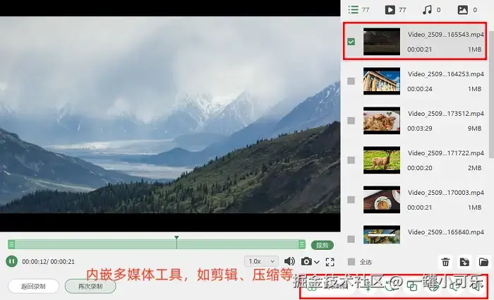 步骤3:录屏结束后,软件会自动弹出录制文件的预览窗口,方便你快速核对内容。如果发现视频存在瑕疵,也无需退出预览界面,直接点击窗口下方的 “高级剪辑” 按钮,即可进入软件自带的编辑模块。在这里,你可以使用 “分割” 工具将视频切成多段,删除不需要的片段,也可通过 “合并” 工具,将多次录制的片段整合为一个完整文件。