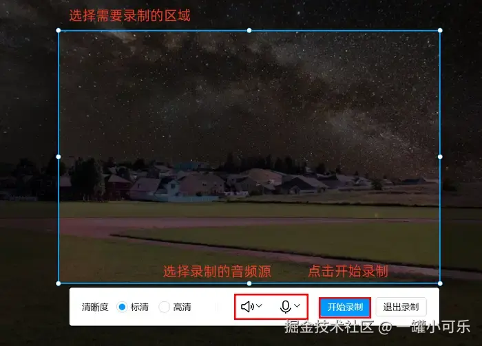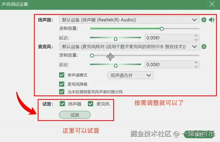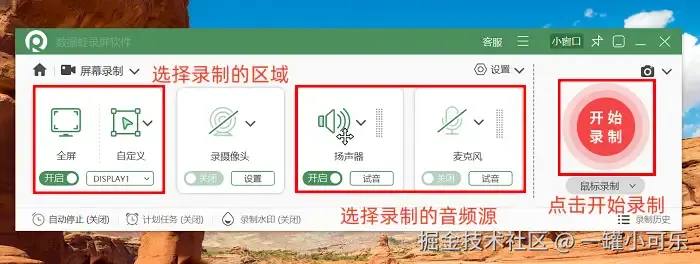 步骤2:接着需要根据录制目标调整两大核心参数——录制区域和声音设置,同时可开启辅助功能提升录屏效率。你还可以打开 “声音输出设置” ,开启麦克风降噪以及试音等操作。所有参数确认无误后,点击 “录制” 按钮正式开始录屏。