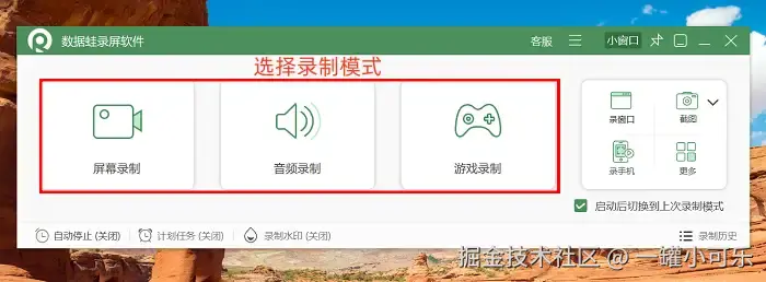 步骤1:首先在你的桌面找到数据 蛙录屏软件的快捷图标,双击启动软件。软件初始化完成后,主界面会展示多种录制模式,不同模式对应不同使用场景。今天我们先以 “屏幕录制” 模式为例,选择后进入下一步设置界面。