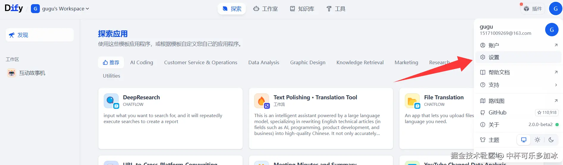 进入Dify前端界面后,打开 Dify 的Settings 进行设置。
