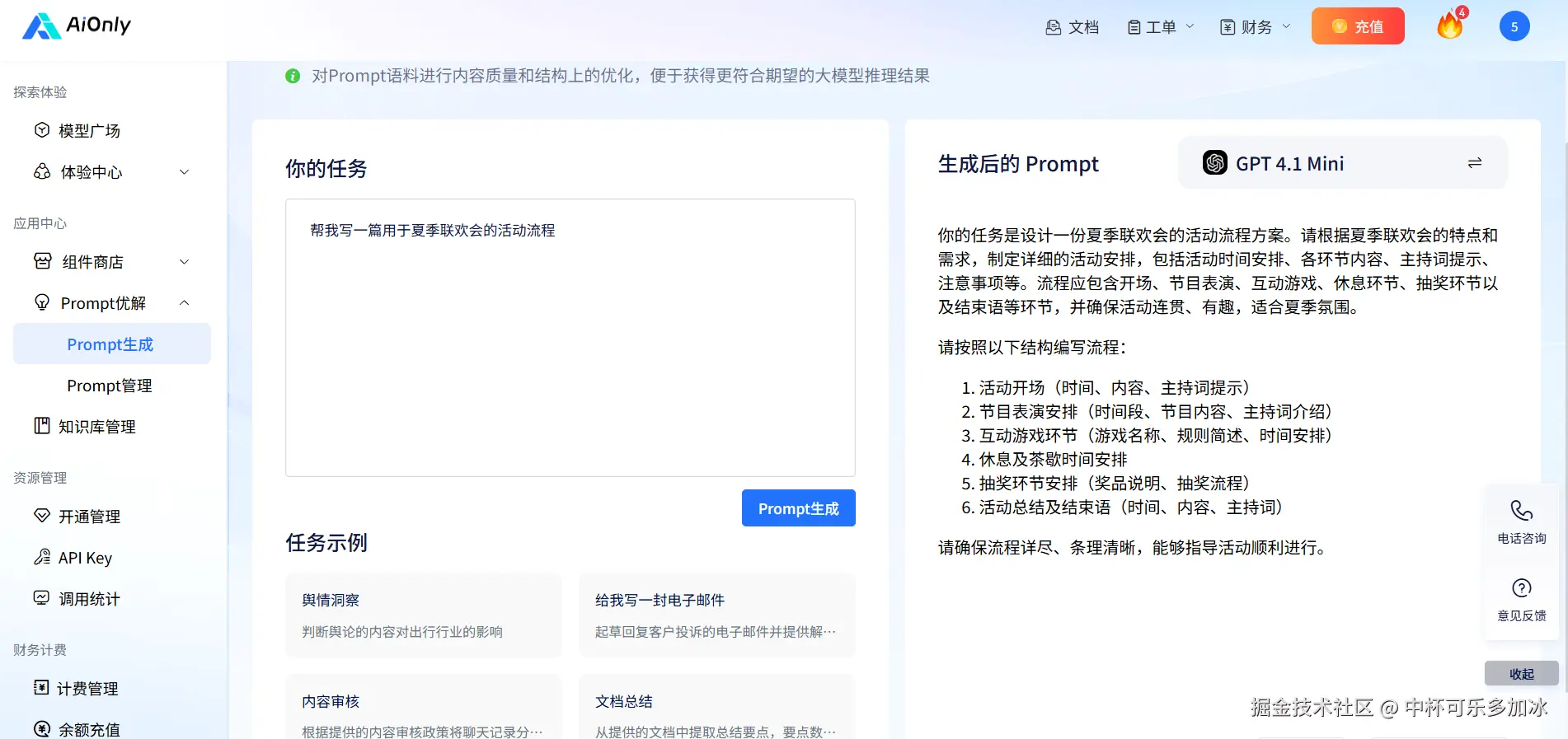 除了基础的大模型服务之外,AiOnly还提供一系列增强功能,例如 Prompt 优化工具与 RAG 知识库管理系统,帮助用户更高效地构建和应用AI能力。