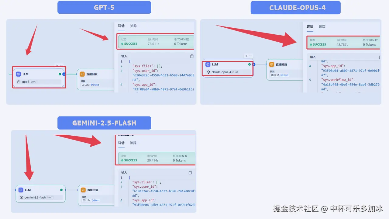 在Agent 工作流编排期间,我们还可以对应用进行调试,选择合适的大模型接入。在AiOnly平台,我们无需额外配置,仅一个接口就可以使用各种全球大模型。 这里我选择了 GPT-5、gemini-2.5-flash、claude-opus-4 进行了测试。