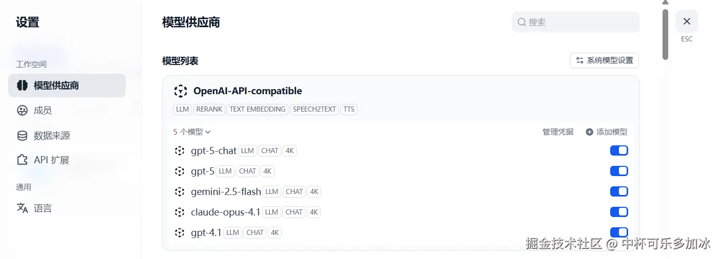 我们点击** Dify 的设置 , 进入模型供应商选项中,添加模型。**