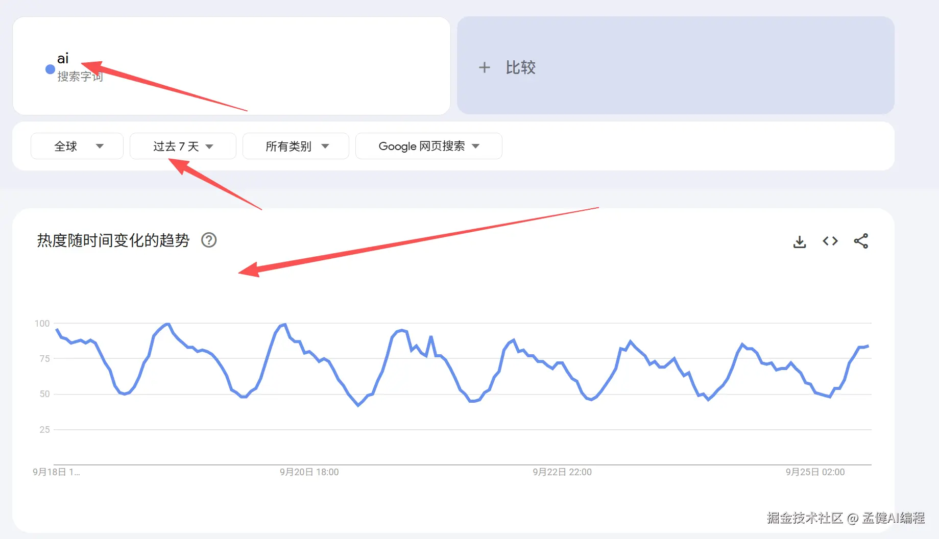 比如,我们搜索 AI,就可以看到全球搜索这个词的趋势: