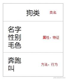- 方法(行为/功能):叫 、跑、咬人、吃、摇尾巴