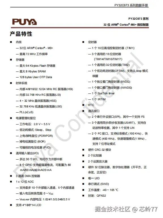 PY32C673 系列微控制器的工作温度范围为 -40 ~ 105 ℃,工作电压范围 2.0 ~ 5.5 V。芯片提供 sleep,stop 低功耗工作模式,可以满足不同的低功耗应用。