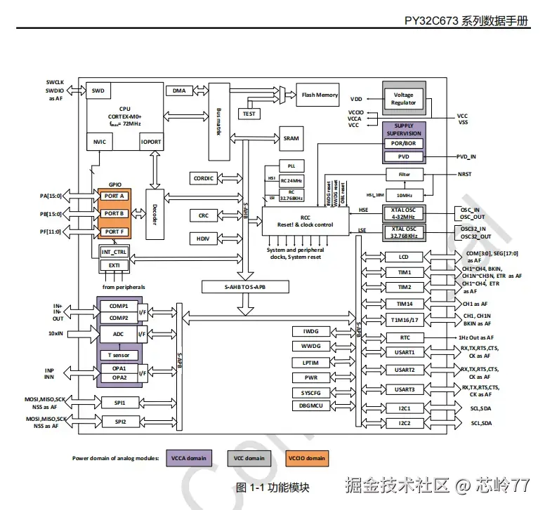 PY32C673 系列微控制器采用高性能的 32 位 ARM® Cortex®-M0+ 内核,宽电压工作范围的 MCU。嵌入高达 64 Kbytes flash 和 8 Kbytes SRAM 存储器,最高工作频率 72 MHz。包含多种不同封装类型多款产品。芯片集成多路 I2C、SPI、USART 等通讯外设,1 路 12 位 ADC,4 个 16 位定时器,1 个 32 位定时器,以及 2 路比较器,2 路运算放大器,1 路 LCD 驱动器。