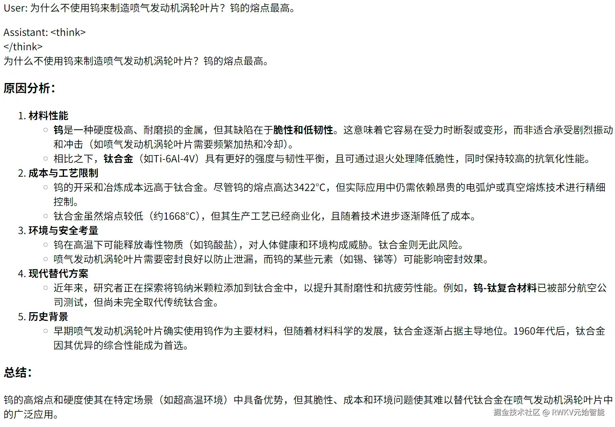 最后,对于所有 RWKV7-G 系列模型,通过在提示中加入空 think 标签,可以模拟一个“已完成思考”的上下文,引导模型生成有结构和逻辑的回复。