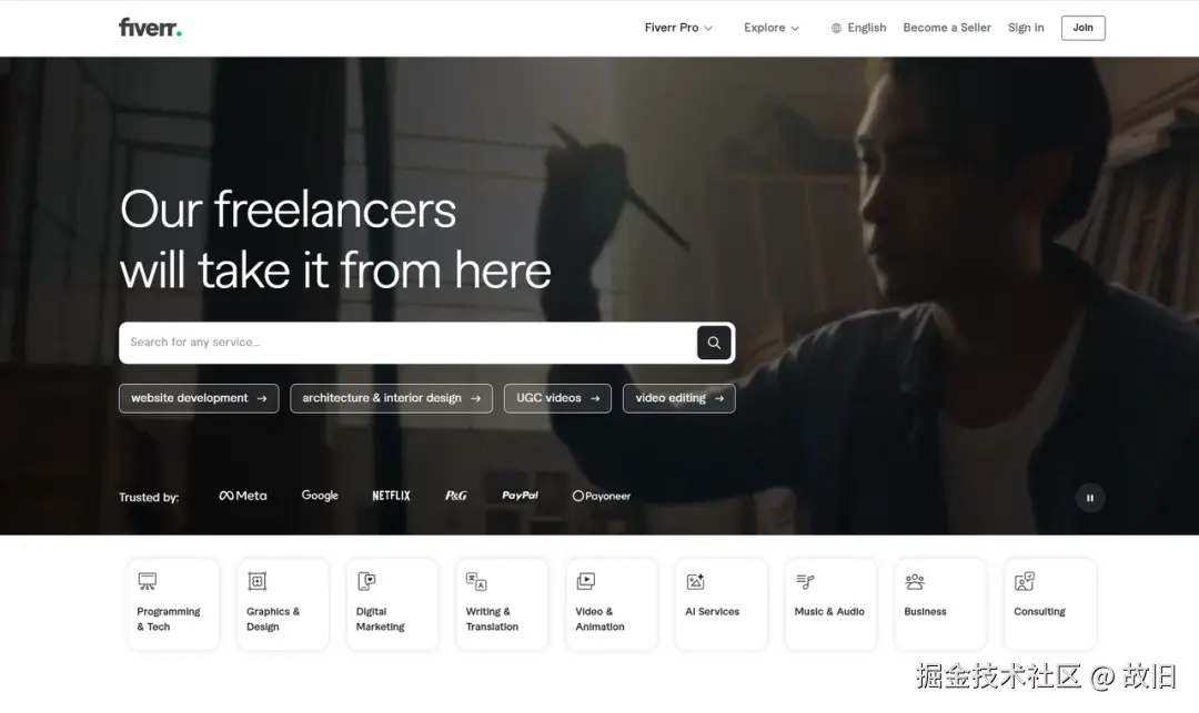 相比 Upwork,Fiverr的玩法就轻松很多。程序员接单不需要去抢单,而是把自己的服务挂上去,比如写一个 Python 爬虫脚本、搭建一个电商独立站、撸一批数据然后分析,然后等客户自己下单。