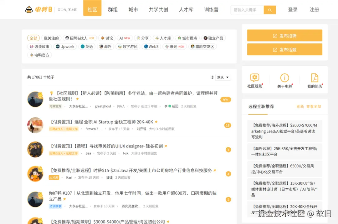 除了大平台,其实国内还有一些小众但很有特色的社区比较适合程序员接单,比如电鸭社区。它主打远程工作和兼职接单,甲方普遍是一些互联网创业团队或个人项目。