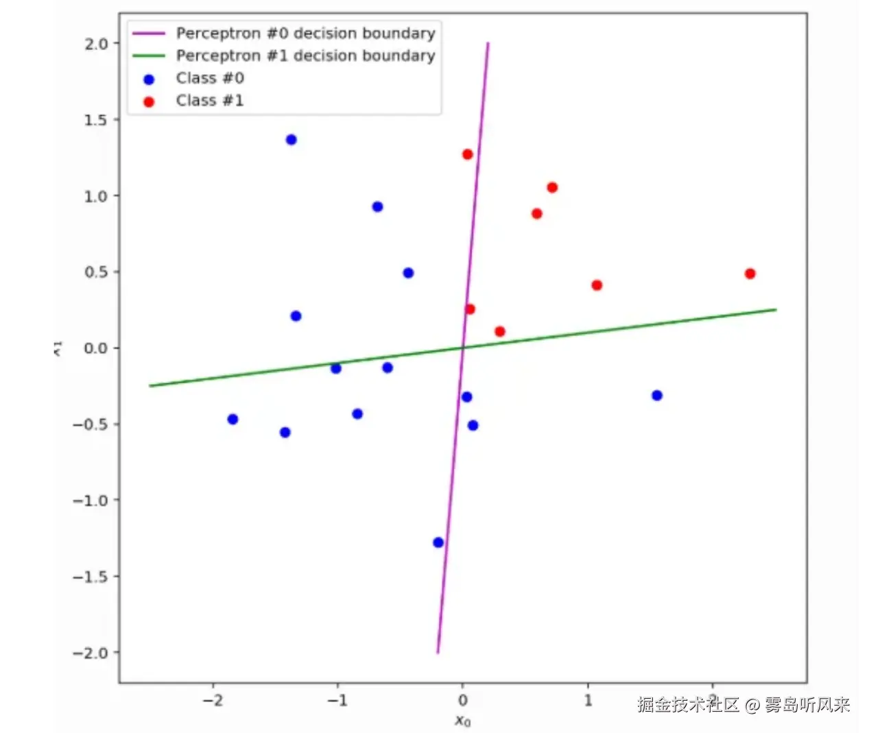 步骤1:为了实现这个想法,研究人员首先将多个感知器堆叠在一起,以创建多个线性边界。例如,对于仅包含两个输入特征的数据集,他们使用两个感知器而不是一个。每个感知器都形成自己的线性决策边界——每个边界捕捉数据集的不同方面,如下图所示: