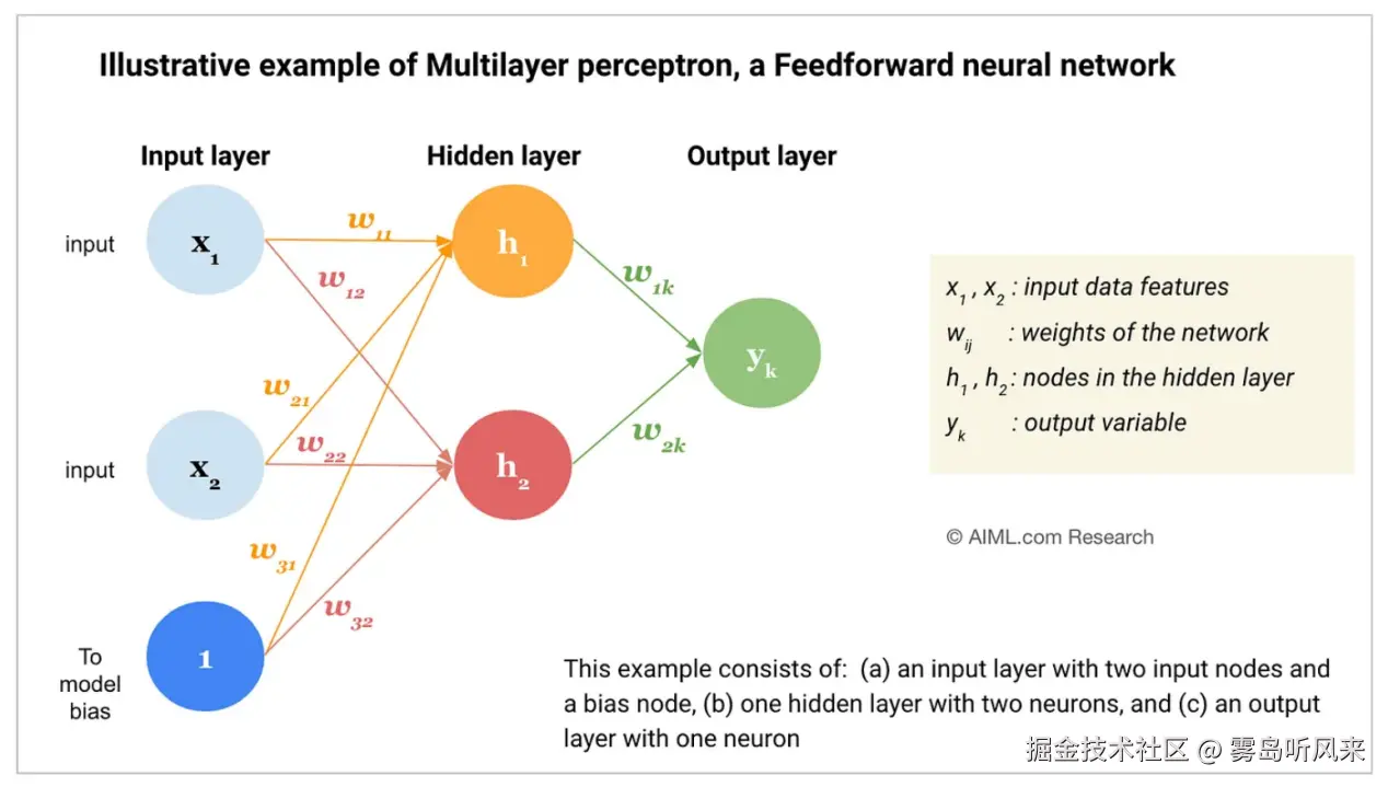输出层是MLP架构的最后一层。它由感知器组成,这些感知器将最后一个隐藏层的结果组合起来,产生最终的预测。该层中的每个感知器还包含两个关键组件: