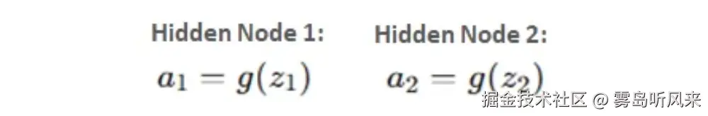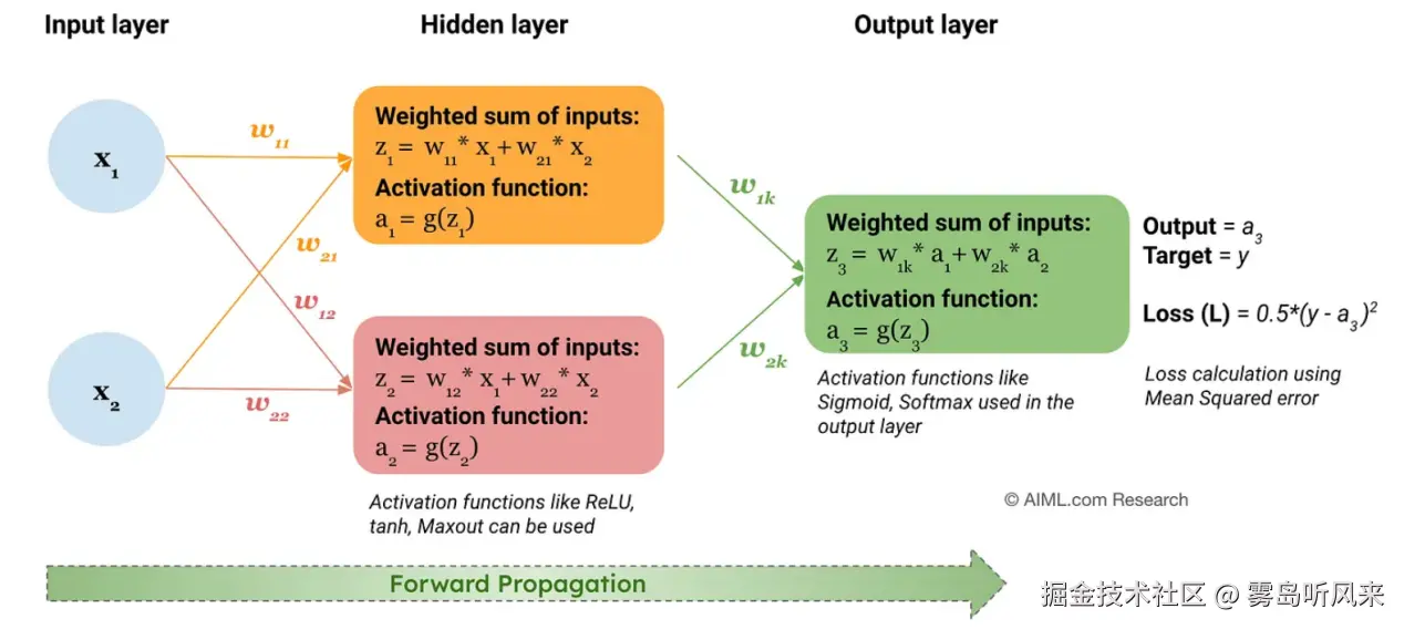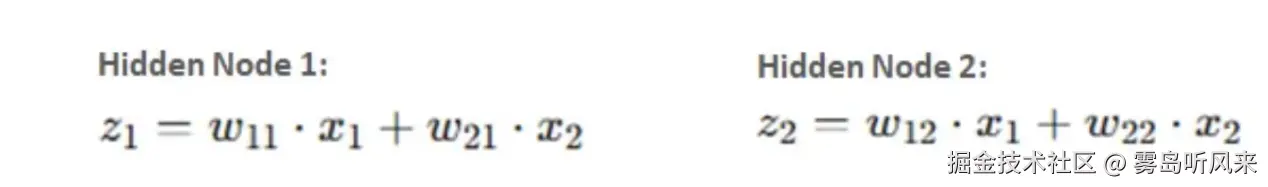 然后,输入(x₁和x₂)被传递到隐藏层的每个神经元。每个神经元接受这些输入,应用其自身的重要性权重并计算加权和: