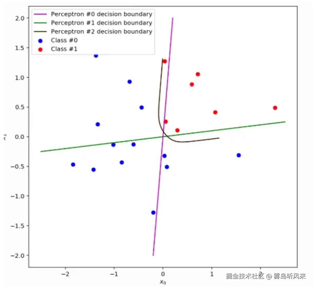 步骤2:下一个挑战是如何将这些单独的边界合并成一个弯曲的边界?这个问题通过添加另一个感知器来解决,该感知器将前两个感知器的输出作为其输入。