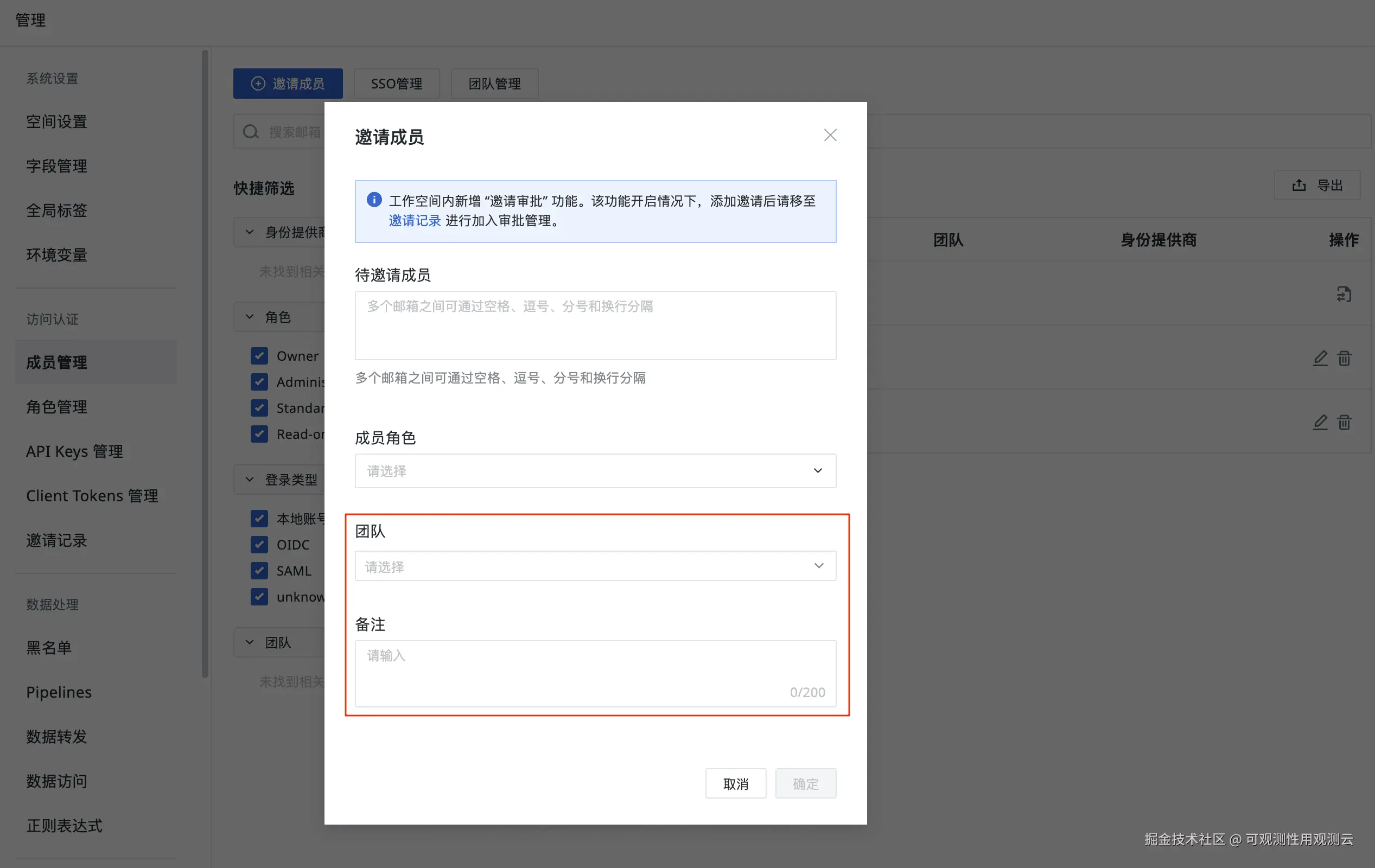 3、邀请成员:新增配置成员所属团队和备注信息。