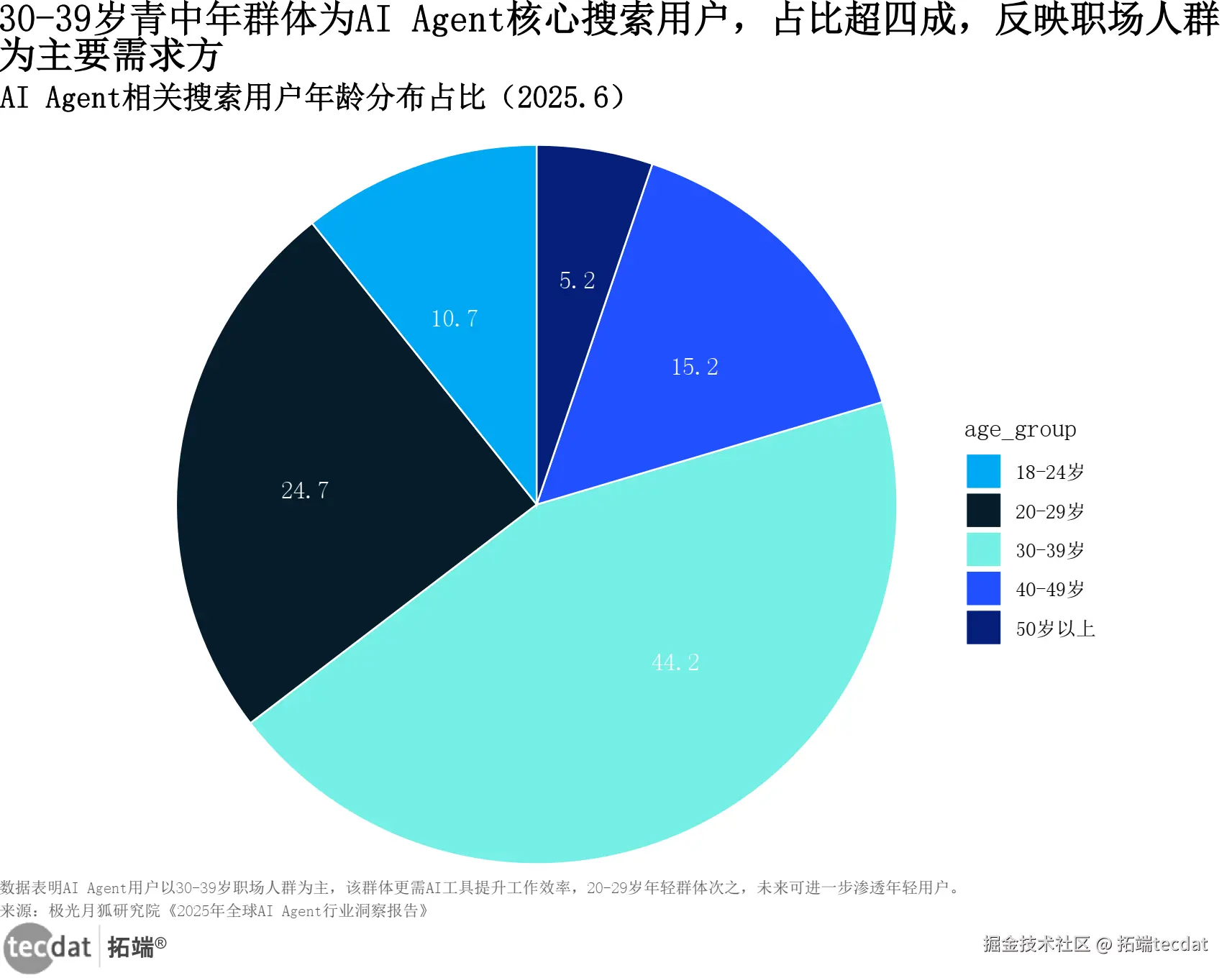 | AI Agent用户年龄分布 | 极光月狐研究院《2025年全球AI Agent行业洞察报告.pdf》 | 30-39岁为核心用户,占比44.2% | 无其他报告冲突数据 | 该群体为职场中坚,需AI工具提升工作效率,需求更迫切 |