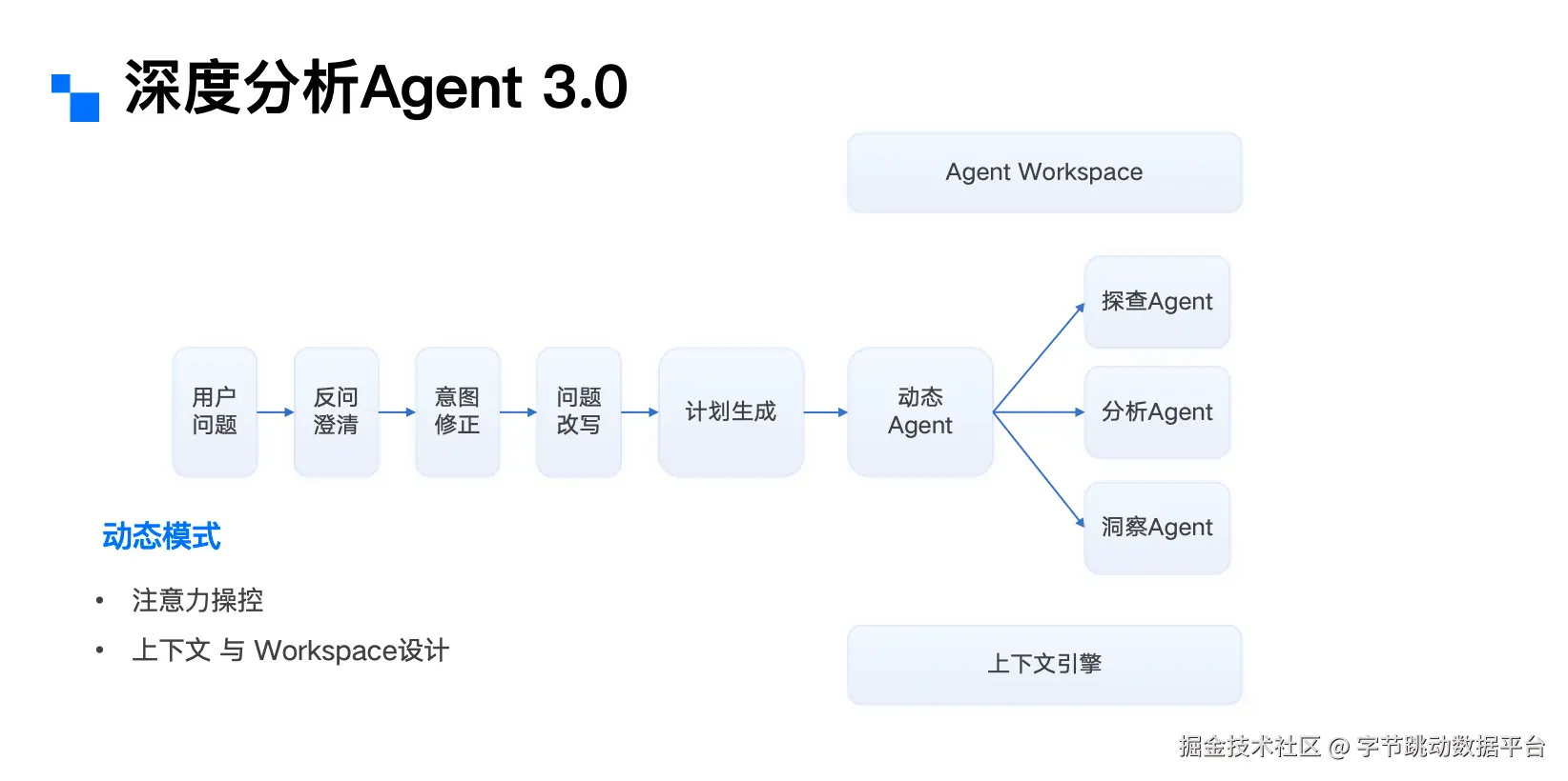 于是我们更进一步:拆分出专门负责数据探查的Agent和专注于数据洞察的Agent,各司其职;配备了上下文引擎来管理记忆;并重新设计了Agent Workspace,本质上是为模型打造一个更趁手的“工作台”,让它能够以更自然的方式调用工具。这就是我们当前3.0架构的核心思想。