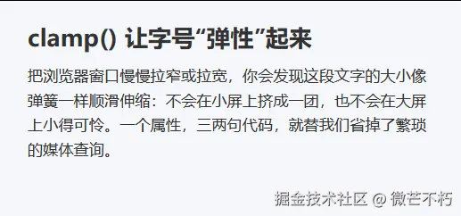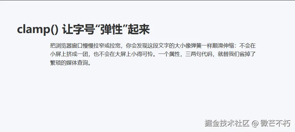 把浏览器窗口慢慢拉窄或拉宽,你会发现这段文字的大小像弹簧一样顺滑伸缩:不会在小屏上挤成一团,也不会在大屏上小得可怜。一个属性,三两句代码,就替我们省掉了繁琐的媒体查询。