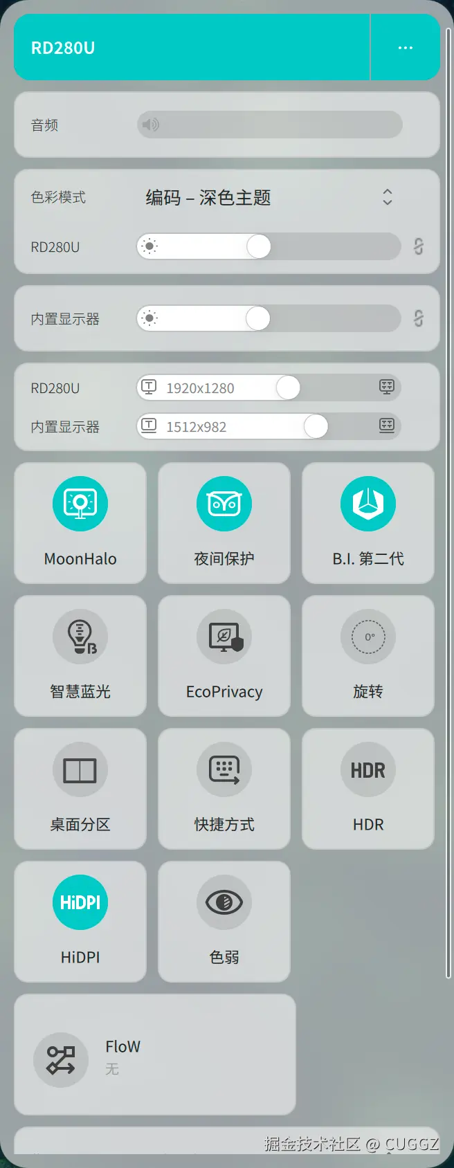 还有一个 猫头鹰模式,能把亮度压得比普通显示器更低。环境光暗的时候会自动触发,半夜盯着 bug 时,不会被屏幕的白光闪到。