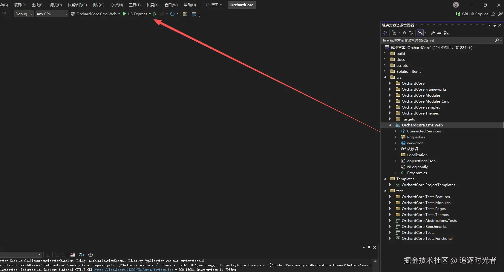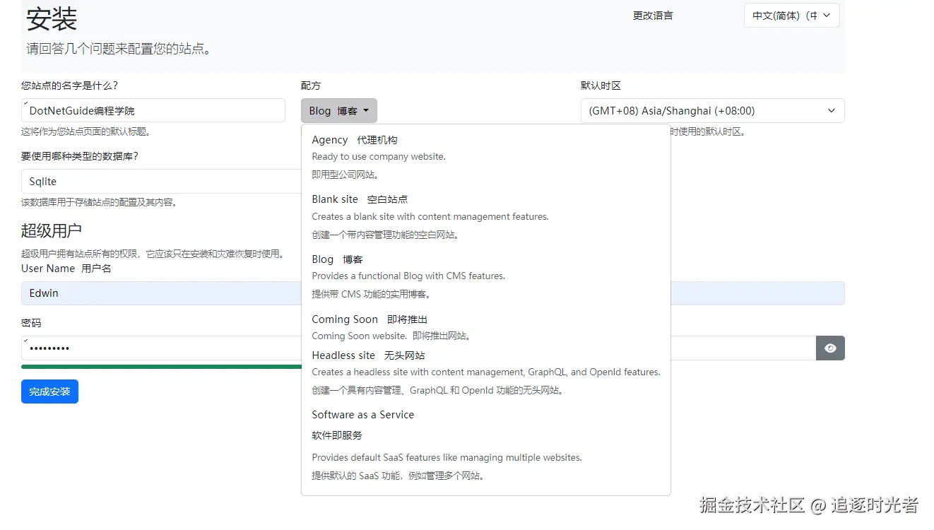 接下来我们运行 OrchardCore.Cms.Web 应用,快速使用可视化的界面配置属于我们自己的多租户内容管理系统(CMS)。