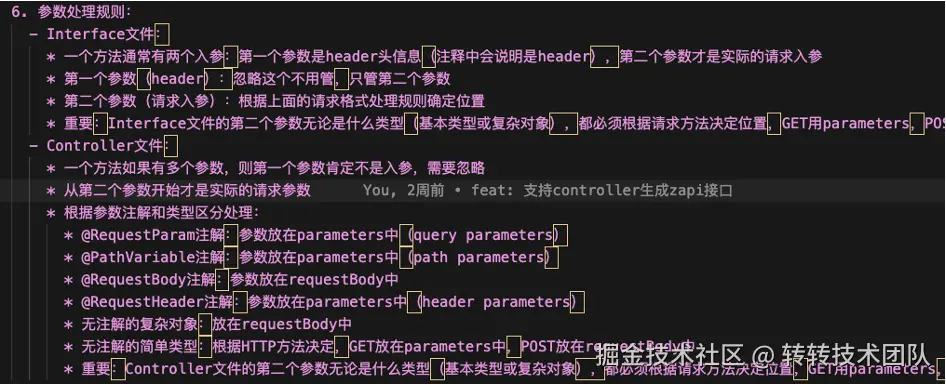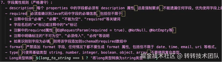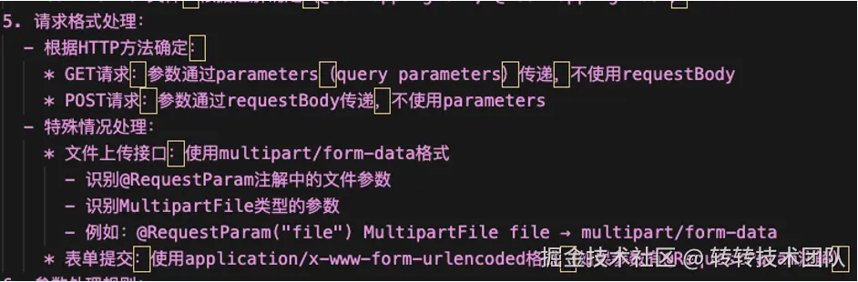经过上面步奏获取到完整上下文的java代码后调用模型接口生成openapi json,我们主要关心接口名称(ZAPI接口名称)、接口路径、请求方法、请求格式、请求参数、字段属性、Tag(ZAPI分类)这些生成的准确度,下面着重讲解下请求格式、请求参数、字段属性: