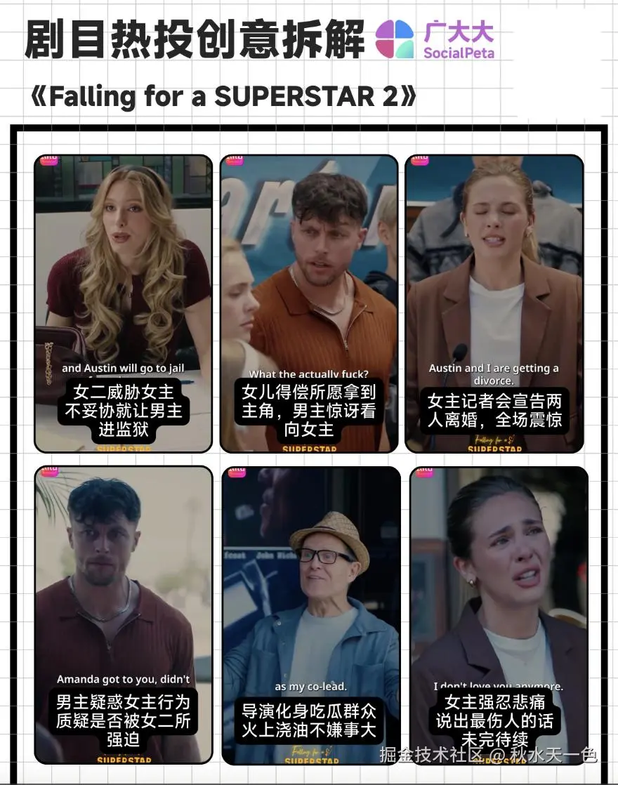 在创意素材方面,该剧还是延续的前作风格,重点塑造两人的深刻感情。以下面这条时长6min15s的素材为例:剧情开篇,恶毒女二直接威胁女主,让其与男主离婚并让自己进入剧组拿到重要角色,让人看得牙痒痒;中间则用女主在记者会宣布离婚引爆全场,此时镜头从男主、女二、导演、女儿以及记者脸上一一闪过,再次加深不同角色的定位塑造;最后,两人因为离婚的争执则让观众看得心痛不已,一句“我不爱你了”又是多少痴男怨女的真实写照呢?
